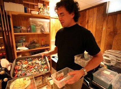 The Associated PressWednesday, December 06, 2006by Michael Felberbaum POP CULTURE -- Turning already-chewed gum into artJamie Marraccini's humble home smells like bubble gum. And it isn't just because he's chewing a piece. The place is filled with original "paintings" and sculptures made from a substance commonly known as "ABC gum" -- as in already been chewed. And now Marraccini is helping others find a new use for what most people chew for a while and toss in the garbage -- or, let's be honest, stick to something that they're not supposed to. "I always felt it was a waste of gum," he said. "But I was happier they'd do that than throw it away because at least then it lived on." And he's not kidding -- besides the countless pieces of gum art, the 36-year-old father of two has amassed a collection of more than 5,000 pieces of chewed gum, some more than 10 years old. And he's made his own share of raw-material contributions to his collection, thanks to his personal love for gum and an aversion to throwing things away. His teachers also unknowingly played a role in developing his gum aesthetic -- when he was a kid, Marraccini was forced to smear his gum inside his locker to keep from getting in trouble for chewing it in class. Over time, his collection evolved from locker wads to the more elaborate pieces that grace his living room walls -- some of them about 2 feet wide. The art, made entirely of gum, ranges in subject matter from outer-space scenes and random faces to sculptures of eggs partying in their carton. In one unfinished piece, eggs sit around a campfire cooking bacon. And all this art takes, well, a lot of gum. So Marraccini is almost always chewing two or three pieces at a time. He also enlists friends and family to keep the collection growing by handing out packages of gum, a storage container and instructions: Chew gum for 20 to 30 minutes and put in case. He then collects the masticated wads for use in his art. (Even old, hardened pieces can be used -- a little warm water brings them back to life.) With an eye toward his continued artistic development, Marraccini also tests new kinds of gum by chewing it, storing it and seeing how the color looks and lasts. (He keeps the rejects too -- it's all part of his collection.) Marraccini also has a real job, at a technology startup. But that "leaves plenty of time for chewing gum," and he's also found time for a side project encouraging others to try out his brand of art. Marraccini's $15 Chew By Numbers kit provides chewers with an opportunity to make art from packs of gum by matching the labeled pieces to a cardboard sheet with numbers on it. In the end, the gum gets transformed into, say, an apple with lips, a pile of gum balls or a planted pot with lips. Marraccini realizes some find this whole idea disgusting. But he offers a reminder that there are benefits to chewing gum -- it helps with motor skills, concentration and creativity, and it can even speed up metabolism. Chew on that. ___ CHECK IT OUT ONLINE Marraccini's art: www.GumArt.com The Chew By Numbers kit: www.ChewByNumbers.com ___ ap contributor Michael Felberbaum once had gum stuck in his hair. It was bright blue and cotton candy flavored, but it wasn't art. ******************** Each of the Chew By Numbers kits comes with a numbered board and lots of gum and costs $14.95.